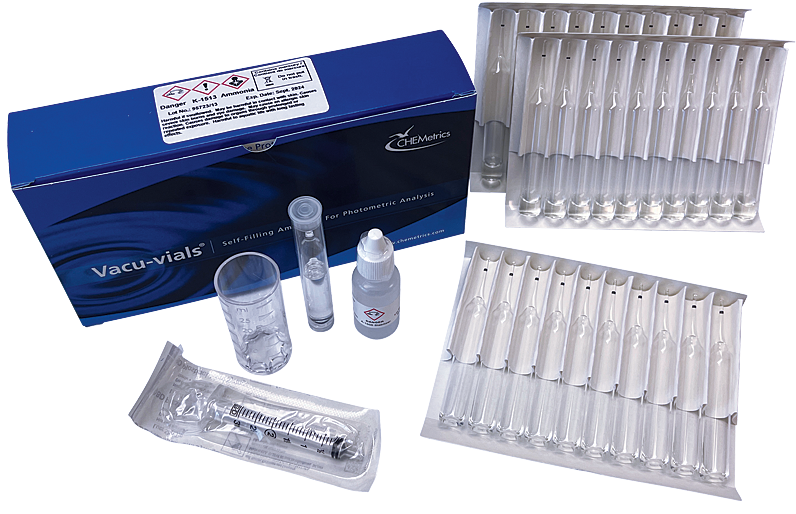 The K-1513 Vacu-vials Ammonia Test Kit comes in a cardboard box and contains everything needed to perform 30 tests: thirty ampoules, Stabilizer Solution, 25 mL sample cup, 3-mL syringe, ampoule blank, and instructions. This kit requires the use of a CHEMetrics Direct-Readout Photometer or a spectrophotometer capable of accepting a 13 mm diameter round cell. Instrument sold separately.