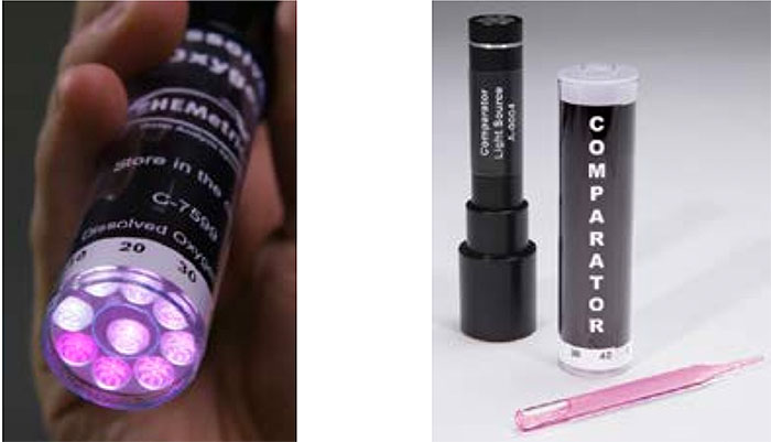 La intensidad del color se compara visualmente a un comparador de color para determinar la concentración de OD. CHEMetrics también ofrece una Fuente de Luz para Comparar (CLS) para usar en condiciones de luz baja. Hay un video disponible sobre el uso de los juegos de pruebas de OD de CHEMetrics en todas las páginas de producto de ppb OD en www.labnw.com.