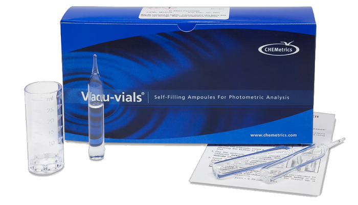 K-7423 utilizes the DPD chemistry. Vacu-vials ampoules work with Single Analyte Meters (sold by CHEMetrics) or any spectrophotometer that accepts a 13mm round cell.